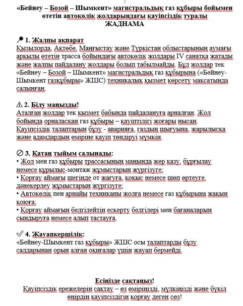 Облысымыздың аумағы бойынша өтетін «Бейнеу-Бозой-Шымкент» магистралды газ құбыры бойымен салынған қызметтік жолдар пайдалануға қауіпті екендігін ескерулеріңізді сұраймыз. Аталған жолдарқызметтік мақсатта салынған және газ құбырындаапат, ақау немесе шұғыл жағдай туындаған кезде газ құбырының арнайы апаттық-диспетчерлік бригадалары тез, әрі еркін қозғалысын қамтамасыз етеді. Бұл жолдар сипаттамасы бойынша IV санатқа жатады, яғни жалпы қолданысқа арналмаған. Оған қоса жол бойымен үлкен қысымдағы магистралды газ құбыры өтетіндіктен адам өміріне аса қауіпті аумақ.