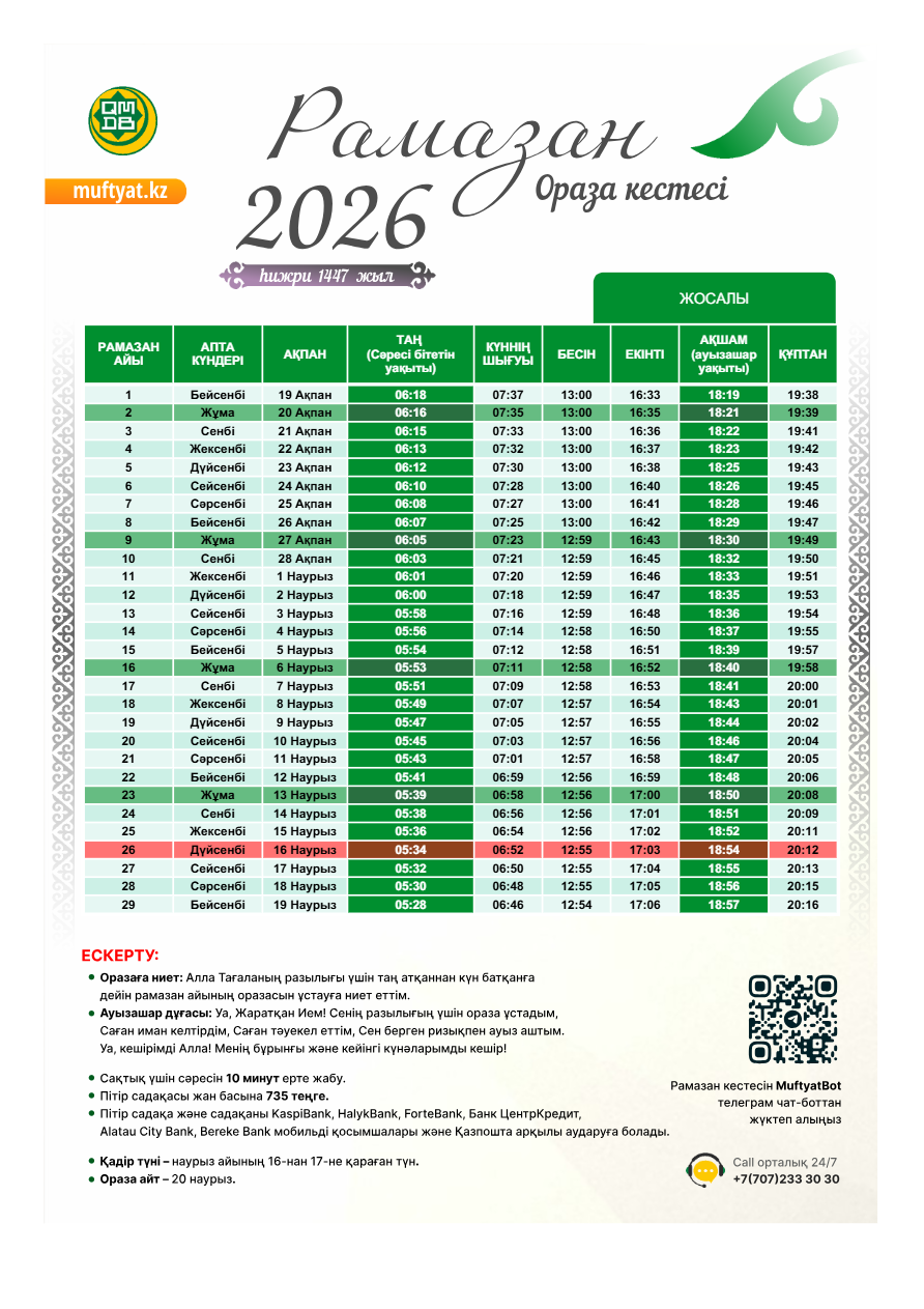 Рамазан кестесі - 2026 Жосалы кенті Қармақшы ауданы Жосалы кенті бойынша намаз оқу, ауыз бекіту және ауыз ашу уақыты көрсетілген 2026 жылға арналған ораза кестесін ұсынамыз.muftyat.kz Жаңалықтар 17 ақпан 2026 ж. 65 0